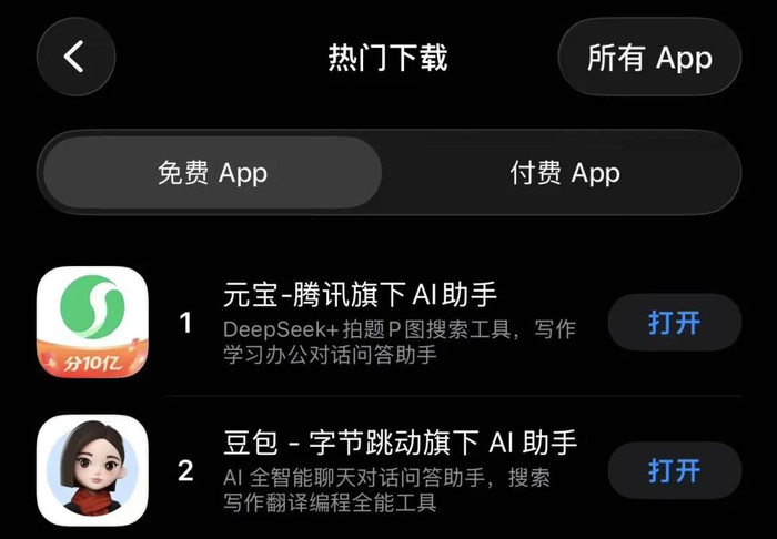 腾讯面向大众用户的C端AI应用目前正在开展春节活动。自2月1日起,用户可以在元宝App上分10亿元现金红包,用户有概率抽中限量100张的价值1万元现金的“小马卡”。春节活动开启后,腾讯元宝的热度迅速攀升,记者看到,腾讯元宝已位列苹果商店免费App排行榜第一,超过字节旗下的豆包。